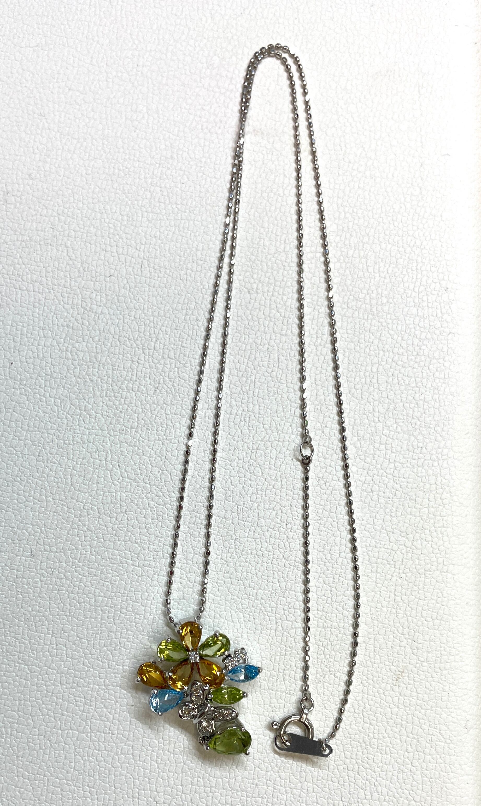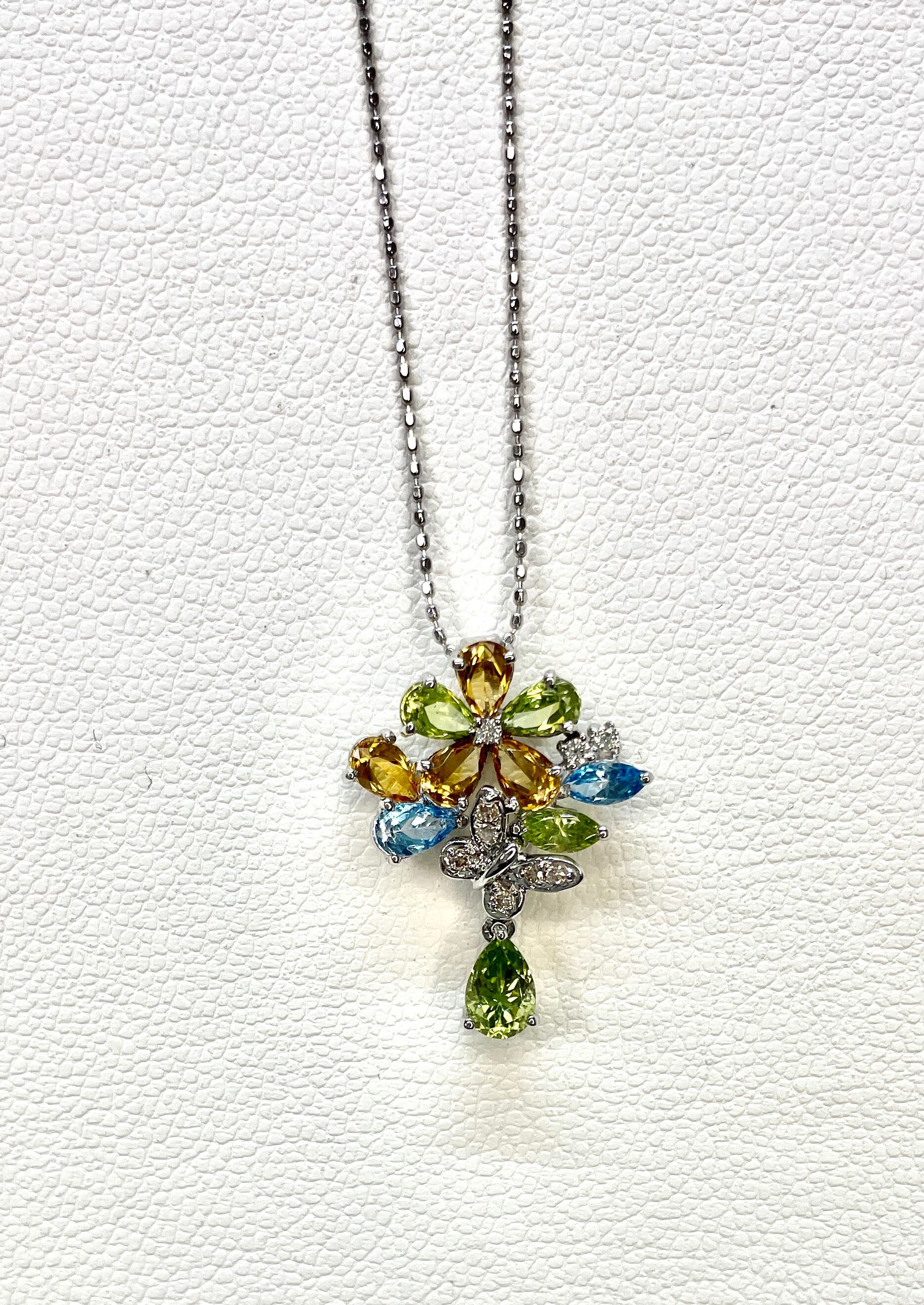 マルチカラーの色々な半貴石がフラワーモチーフで可愛らしくデザインされたネックレスです
