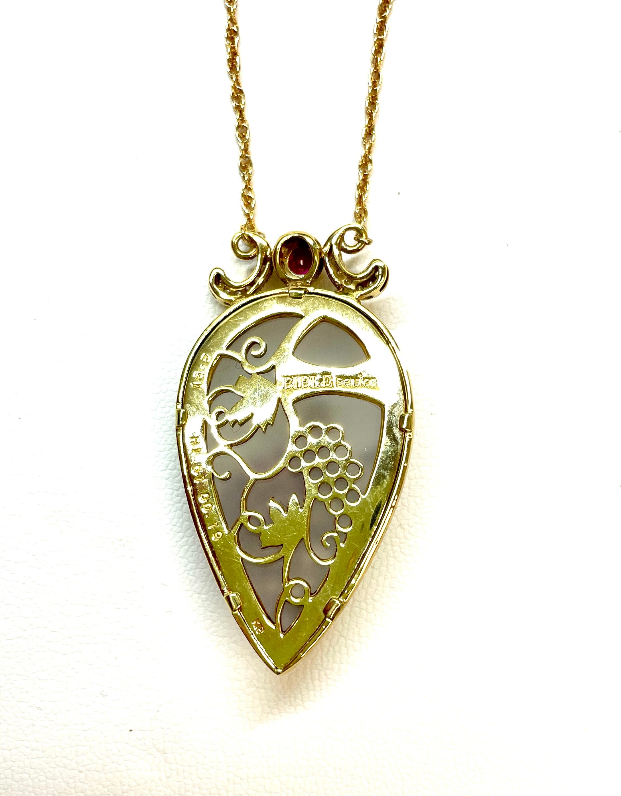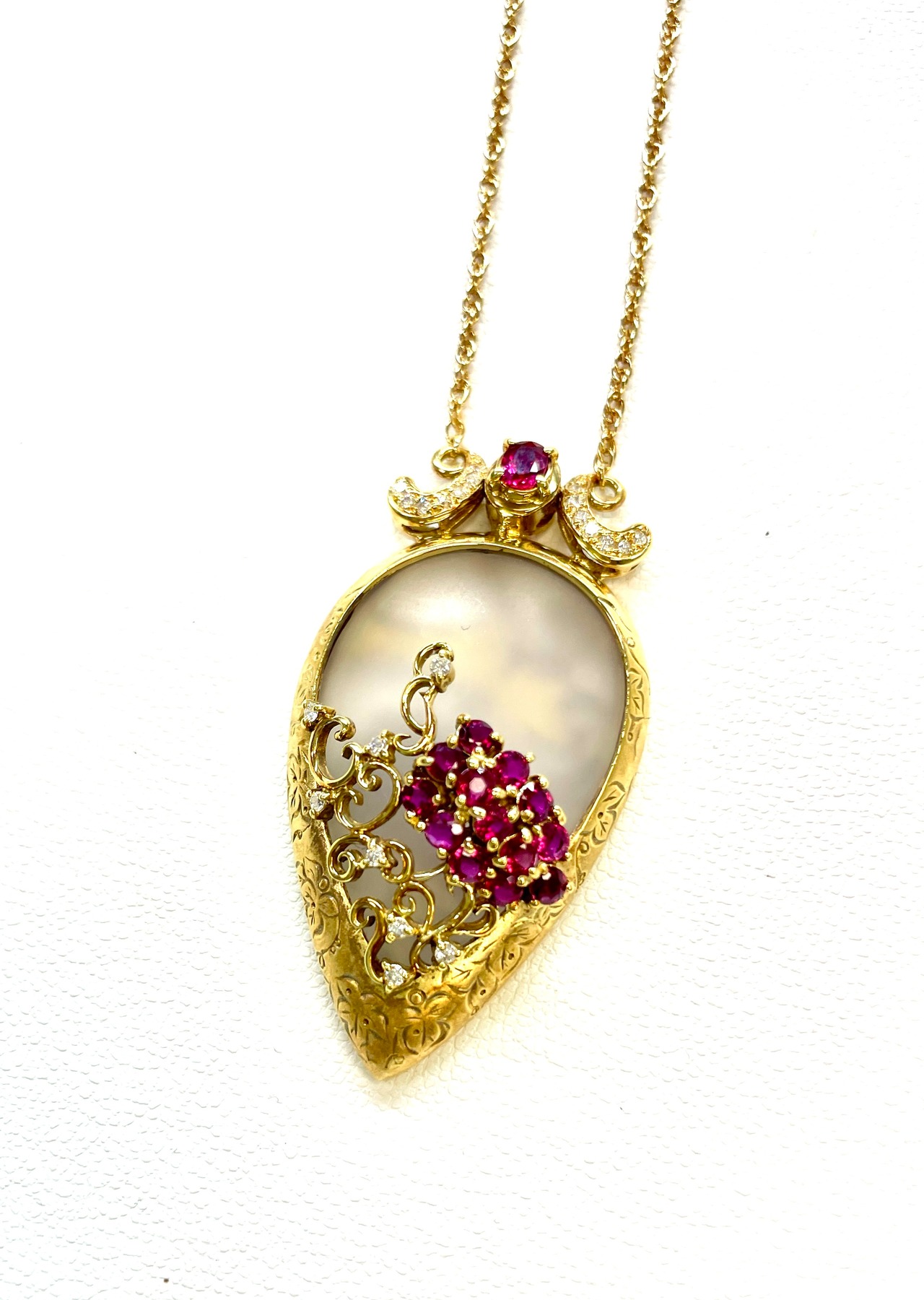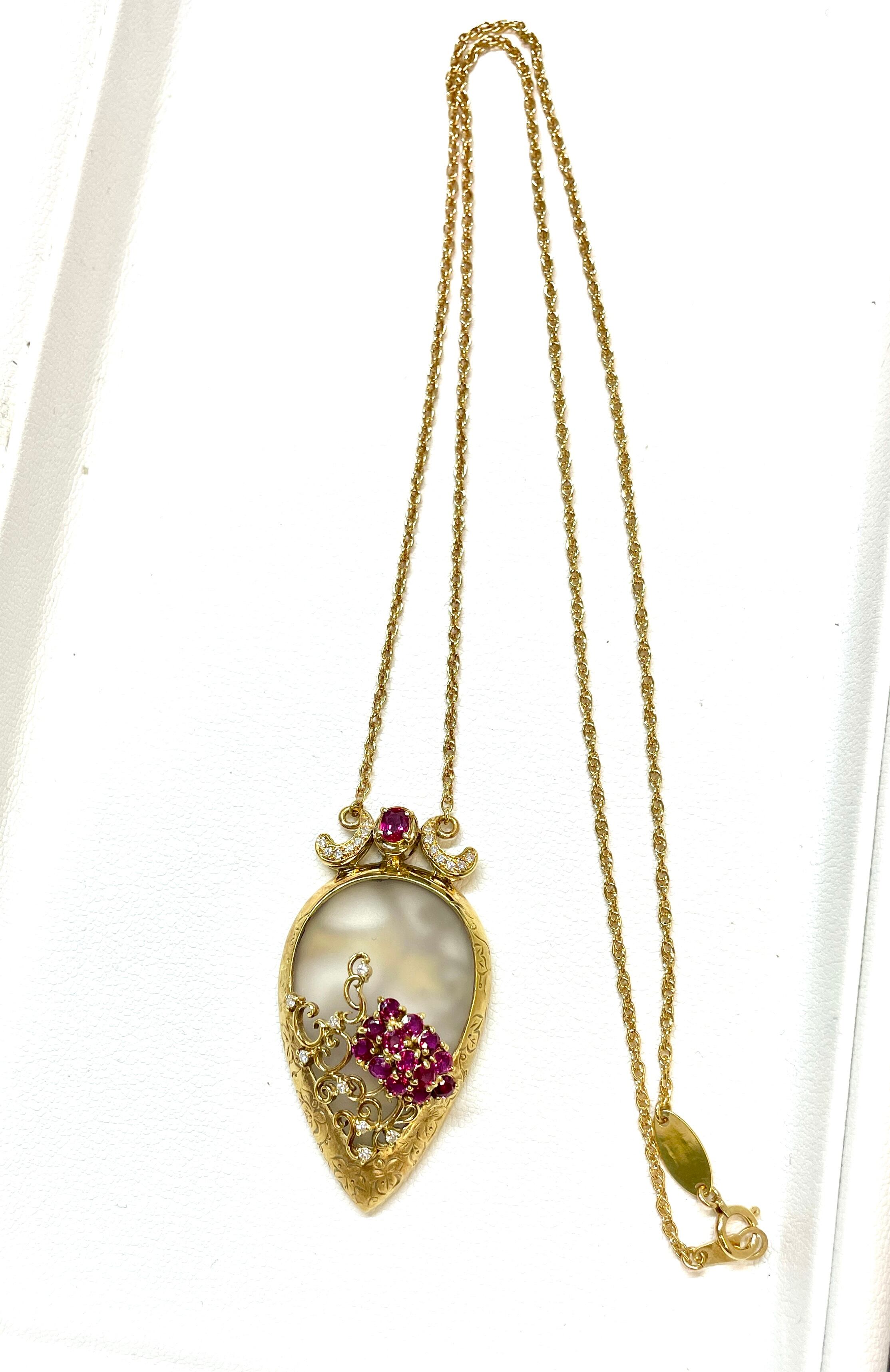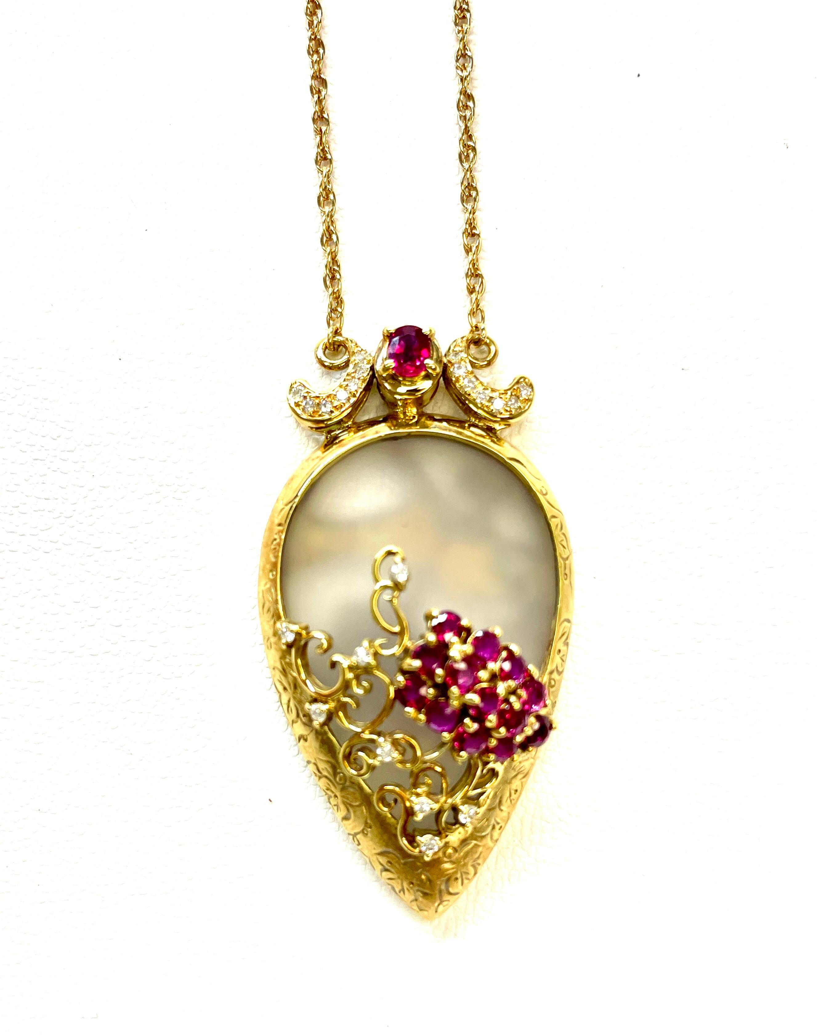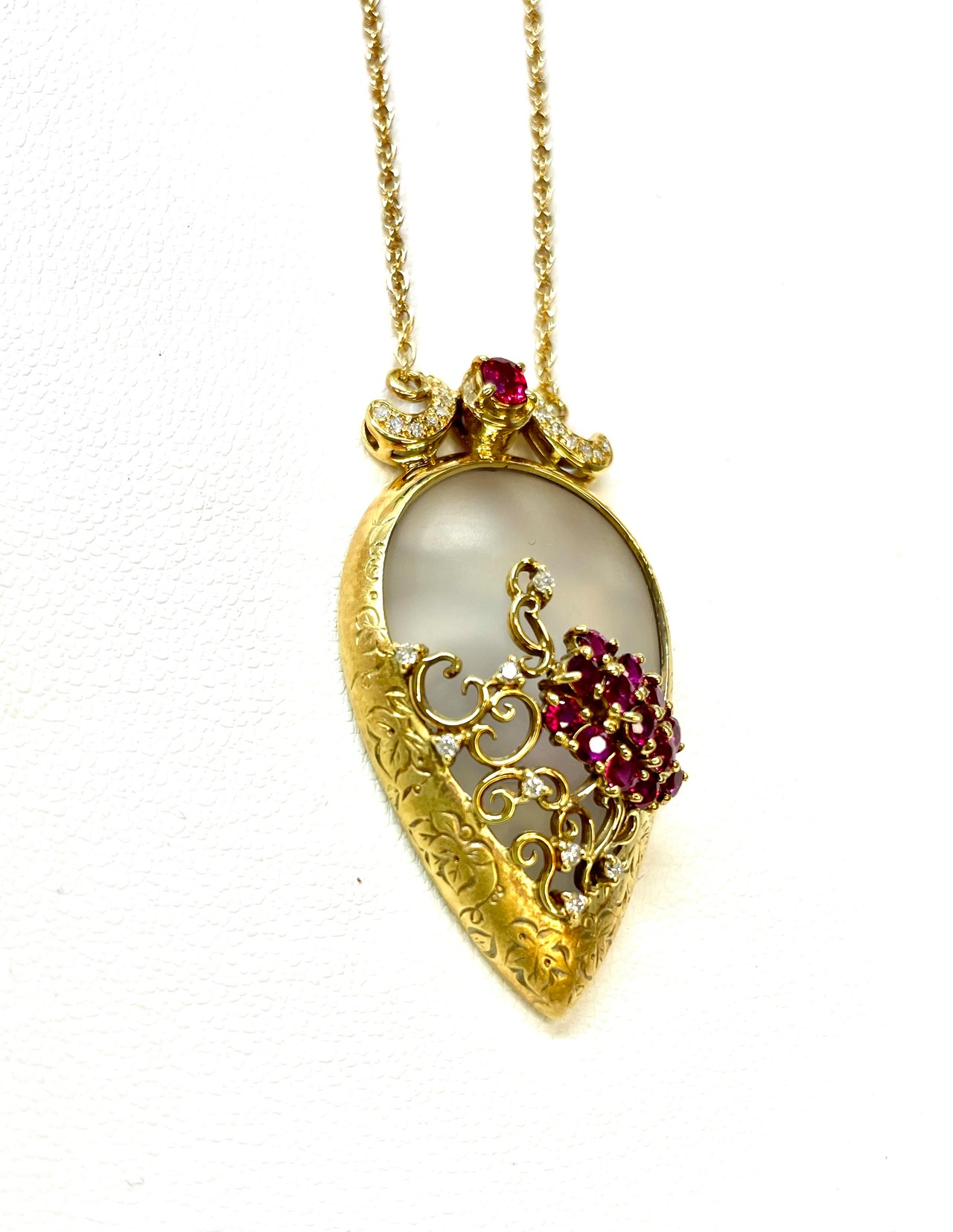 大きなクォーツの上に、ぶどうモチーフのルビーを配置した、とても手の込んだお作りのペンダントです